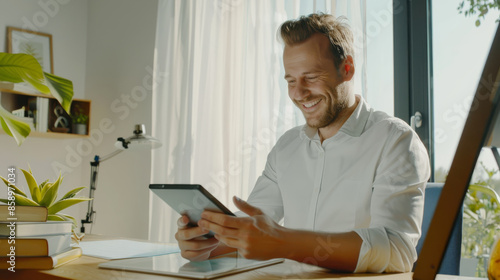A cheerful man in a bright, sunlit office space smiling while looking at a tablet, with plants and books around.
