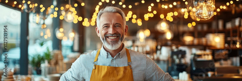 A cheerful man with beard smiles warmly in cozy cafe, adorned with string lights and welcoming atmosphere. His apron suggests he is owner or barista, creating friendly vibe