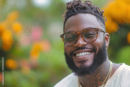 A cheerful man with dreadlocks and glasses beams with happiness in a lush garden. The background is alive with various colorful flowers, creating a warm and inviting atmosphere that enhances his joyfu