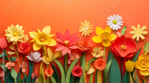 A cheerful paper flower bouquet with daffodils tulips and daisies in vibrant yellow orange and red shades.