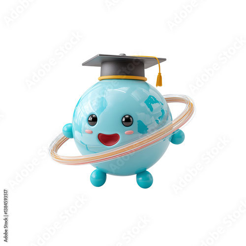 A cheerful planet character wearing a graduation cap, surrounded by a glowing ring, symbolizing education and global awareness.