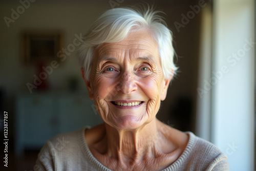 A cheerful senior with white hair and bright eyes smiling warmly in a cozy home