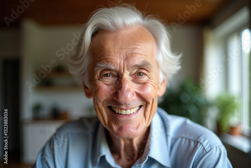 elderly, happy, smiling, portrait, closeup, joyful, retirement, wellness, healthy lifestyle, content, cheerful, relaxed, friendly, warm, happiness, home, cosy, natural light, emotional, wisdom, confidence, golden years, peaceful, comfortable, indoor, grandfather, senior citizen, good health, retirement home, optimism, inspiring, laughter, kind