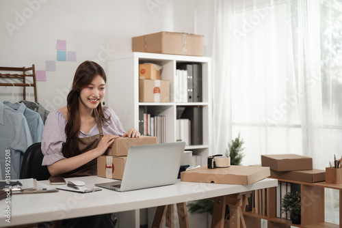 A cheerful small business owner in an apron interacts with her laptop while handling packed boxes, A Happy Seller at Work, Online Business Success