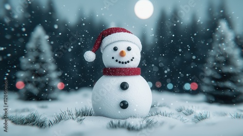 A cheerful snowman wearing a red hat stands in a snowy landscape, surrounded by trees, with softly falling snowflakes and a bright moon in the background.