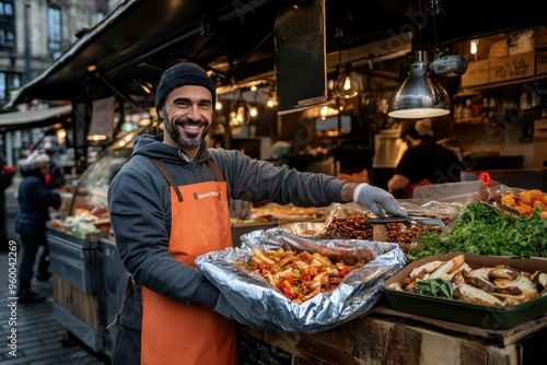 seller, smiling, serving, meal, cheerful, beanie, apron, client, culinary, passion, culture, cook, street, vibrant, urban, market, happy, chef, celebration, tied-up, flavorful, cooking, delicious, enjoyment, open, commercial, product, appetising, energetic, preparation, fall season, sense, handcraft