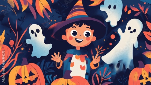 A cheerful witch in a pointy hat smiles amidst Halloween decorations, surrounded by friendly ghosts and pumpkins, symbolizing joy, festivity, trick-or-treating, and spooky fun.