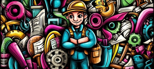 A cheerful worker stands amidst colorful tools and materials, symbolizing creativity and industry.