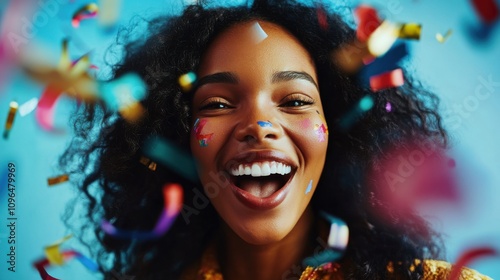 A cheerful young woman rejoicing with confetti in front of a bright background.