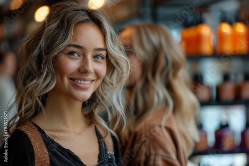 woman, blue eye, indoor, wavy hair, blond, cheerful, beauty, smile, happiness, joy, youth, elegance, charme, modern, expressive, confidence, casual attire, curly hair, fashion, style, friendly, portrait, face, people, person, female, glowing, optimism, radiance, lifestyle, candid, bright, young adult, relaxed, retail, cosmetic, shop, authentic, bokeh