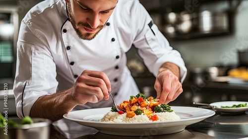 A chef in a professional kitchen plating a gourmet dish with rice as the base, emphasizing culinary creativity.