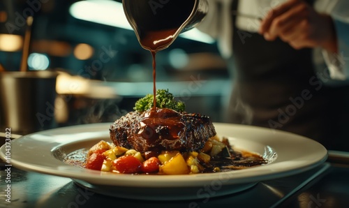 cook, food, meal, vegetable, chef, preparation, dinner, kitchen, epicure, cookery, lunch, pan, background, professional, ingredient, steak, hot, fresh, dish, sauce, frying, catering, healthy, delicious, meat, culinary, red, flames, grill, tasty, pouring, plate