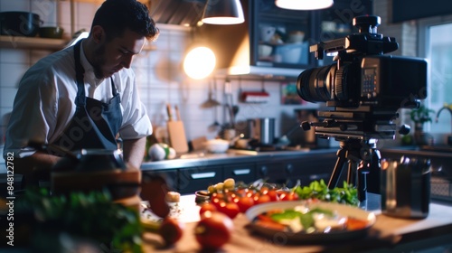 A chef prepares ingredients in a modern kitchen while being filmed by a professional camera for a cooking show.