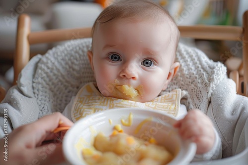 A cherubic toddler blissfully indulges in his meal, his tiny hands gripping the spoon as he sits contently in his high chair, while his human face is adorned with a look of pure joy and satisfaction