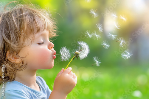 A child blowing dandelion seeds, with a look of wonder and happiness