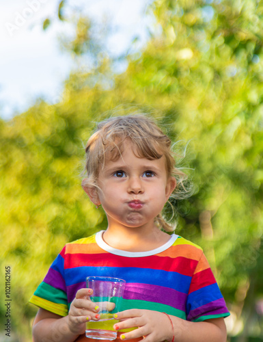 A child drinks water from a glass. Selective focus.