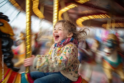 A child gleefully rides a vibrant carousel, embodying pure delight and the spirit of fun.