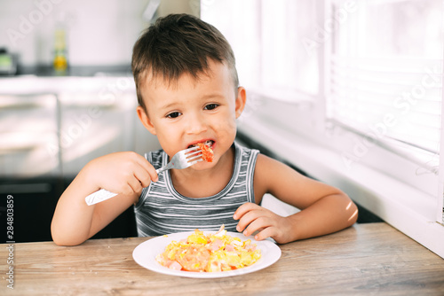 a child in a t-shirt in the kitchen eating an omelet with sausage and tomatoes
