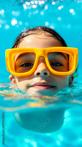 A child in bright yellow goggles partially submerged in a pool, smiling and enjoying the water on a sunny day.