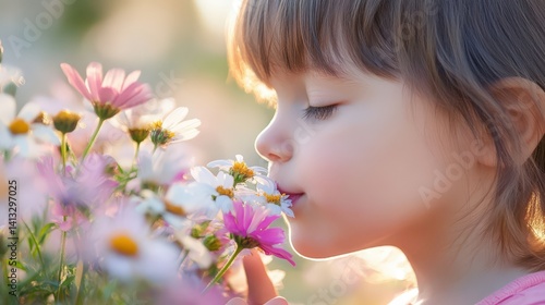 children, girl, flower, garden, nature, outdoors, springtime, summer, beauty, bloom, blossom, flower petals, fragrance, smell, sunlight, innocence, happiness, sweet, gentle, delicate, colourful, vibrant, pretty, joyful, peaceful, serene, childlike, adorable, lovely, inhaling, nose, profile, daisy, pink, white, purple, tender, soft, fresh, flower, woman, spring, childhood, face, children, person, smiling, smile, bouquet