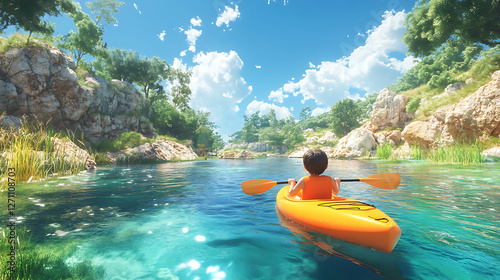 children, playing, kayak, clear, river, water, sport, adventure, fun, summer, rowing, paddle, active, exploration, freedom, flow, calm, playful, nature, peaceful, childhood, activity, bright, sunny, sky, blue, green, forest, greenery, creek, stream, travel, environment, scenic, refreshing, exercise, joy, happiness, calm water, flowing, current, leisure, family, exploring, rafting