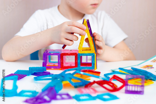 A child plays with a magnetic constructor on a white table. Building a toy house from blocks. Hands close up.
