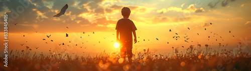 A child s silhouette against a sunrise: symbolizing hope and new beginnings. Ideal for inspiring and educational advertisements. Photo realistic concept image in Adobe Stock.