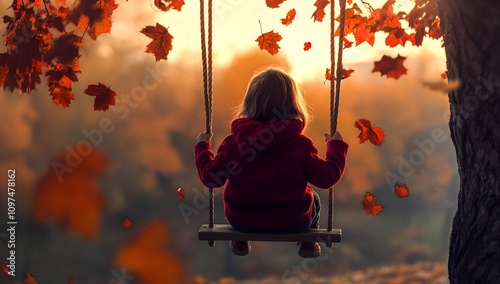A child sitting on a swing in an autumn park, viewed from behind. A beautiful child enjoying nature during the fall season.
