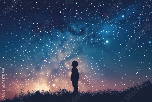 A child standing under a night sky filled with stars and the Milky Way, looking up in amazement