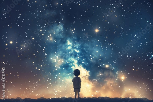 A child standing under a night sky filled with stars and the Milky Way, looking up in amazement