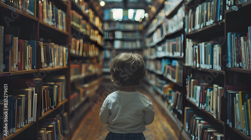 A child surrounded by books in a library, exploring the world of literature and knowledge.