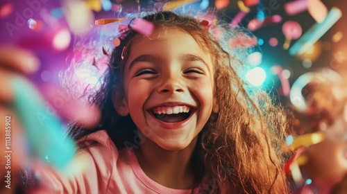A child with a big smile celebrates amid colorful confetti, capturing a moment of pure joy and happiness in a lively and vibrant atmosphere.