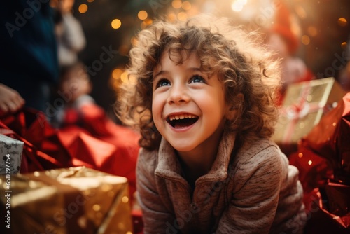 A child's delighted response when greeted by a stack of gifts