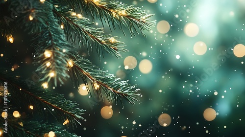 A Christmas background with fir tree branches and sparkling bokeh lights, perfect for a winter holiday theme.