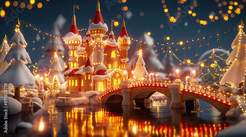 A Christmas decorated castle in cold winter's night with a wooden bridge across a lazy river