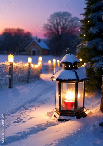 A Christmas Lantern On A Snowy Path, At Dusk.