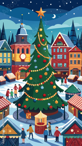 christmas, tree, people, town, several, small, building, festive, joyful, snow, holiday, winter, illustration, background, city, merry, cartoon, vector, celebration, landscape, season, village, decoration, house, street, happy, new, year, christmas, night, december, greeting, snowflake, card, vintage, snowfall, flat, design, architecture, home, retro, nature, banner, snowman, art, santa, postcard, sky