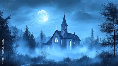 church, forest, moon, night, sky, tree, fog, misty, full, blue, dark, landscape, mysterious, gothic, skittish, building, church steeple, church steeple, window, silhouette, shadow, mystical, surreal, dreamlike, atmosphere, tranquil, serene, peaceful, solitude, nature, beauty, religious, faith, hope, inspiration