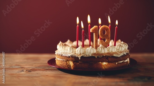 A cinnamon cake with candles in the shape of the number 19, against a maroon background
