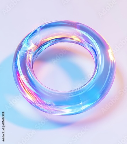 A circular glass ring, with light blue and rainbow colors, in an isometric view, on a white background, with studio lighting.