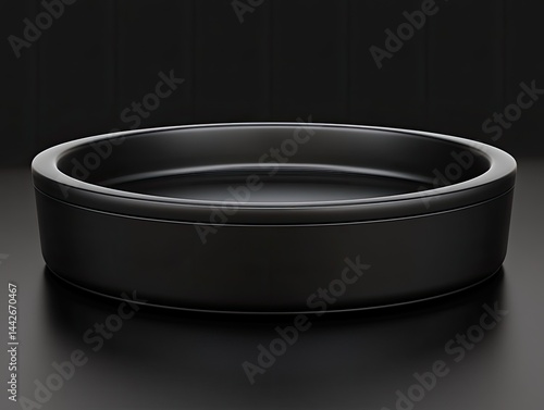 black, round, bowl, decorative, circular, dark, glossy, object, surface, modern, design, shape, simple, empty, container, vessel, studio, product, still, life, three-dimensional, rendering, illustration, photographic, image, realistic, geometric, smooth, polished, matte, rim, edge, top, bottom, wide, shallow, minimalist, modernist