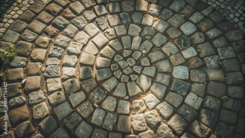 A circular pattern of gray cobblestone, the stones arranged in a spiral with a radiating effect, creating a visually captivating and texturally rich surface.