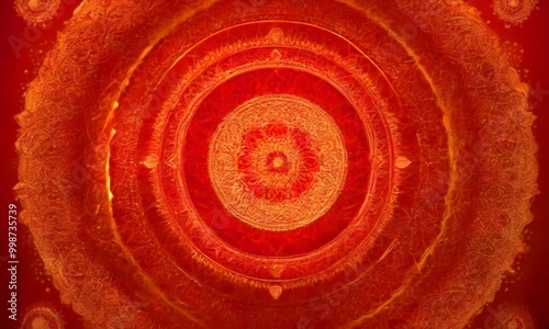 a circular pattern with a central design and radiating lines, set against a deep red background