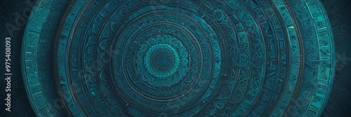 a circular pattern with intricate designs and patterns in shades of blue and green, creating a visually striking and immersive environment.