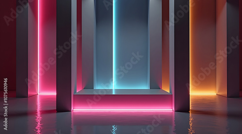 A circular podium with vibrant pink and blue gradient tones,illuminated by soft,diffused light. Space for product for sale and marketing