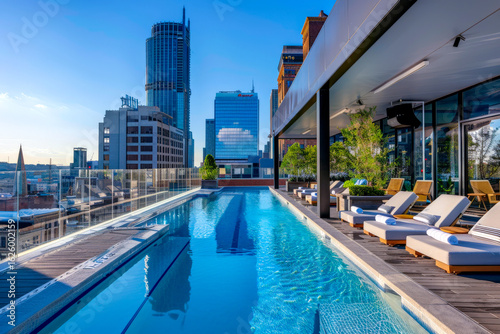 A city rooftop pool with sun loungers and a skyline backdrop.