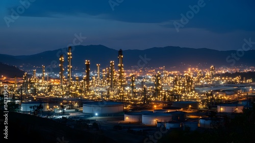 A city skyline at night with many tall buildings and a large number of oil refineries. The city is lit up with lights and the sky is cloudy