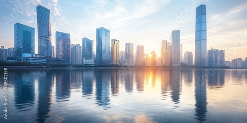 A cityscape of high-rise buildings reflected in the waters of a river, where the towering structures meet the calm surface