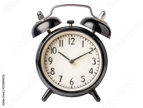 A classic black alarm clock with a white face, featuring two bells at the top and bold black numbers indicating the time.