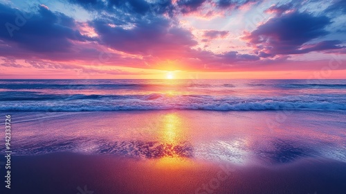 A classic California beach sunset with vibrant colors reflecting off the ocean. Clear copy space.